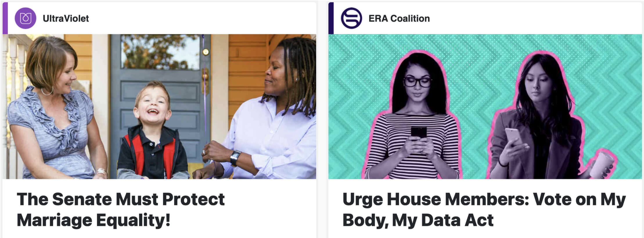 UltraViolet and the ERA Coalition are two phenomenal nonprofits leading the fight for gender justice and women’s rights. We’re excited to be helping both groups acquire fired-up supporters who want to hear from them.